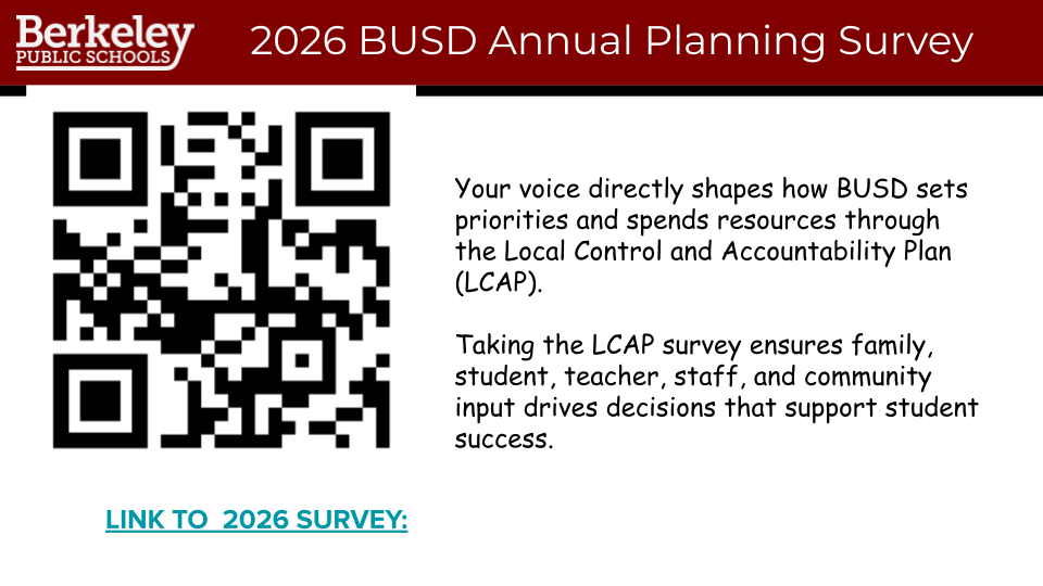Please take the opportunity to fill out the district-wide survey about the Berkeley LEARNS After School Program. Your feedback helps the district understand what is working well and what can be improved: https://tinyurl.com/LEARNS-survey