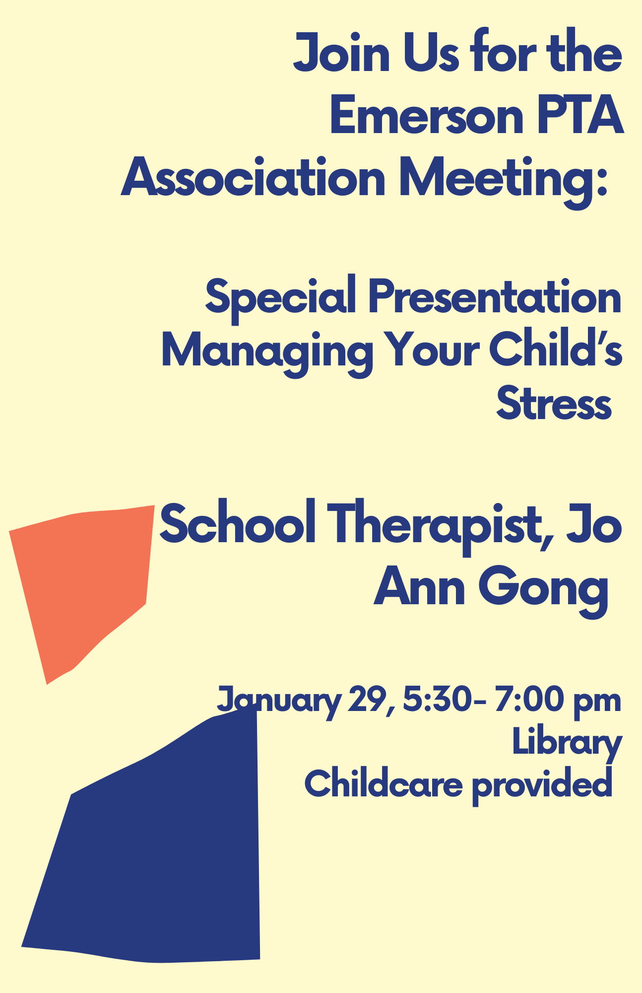 Thursday, January 29: PTA Association Meeting, 5:30 - 7:00 pm, Guest Speaker, Jo Ann Gong: “Managing Your Child’s Anxiety & Stress”, Emerson Library