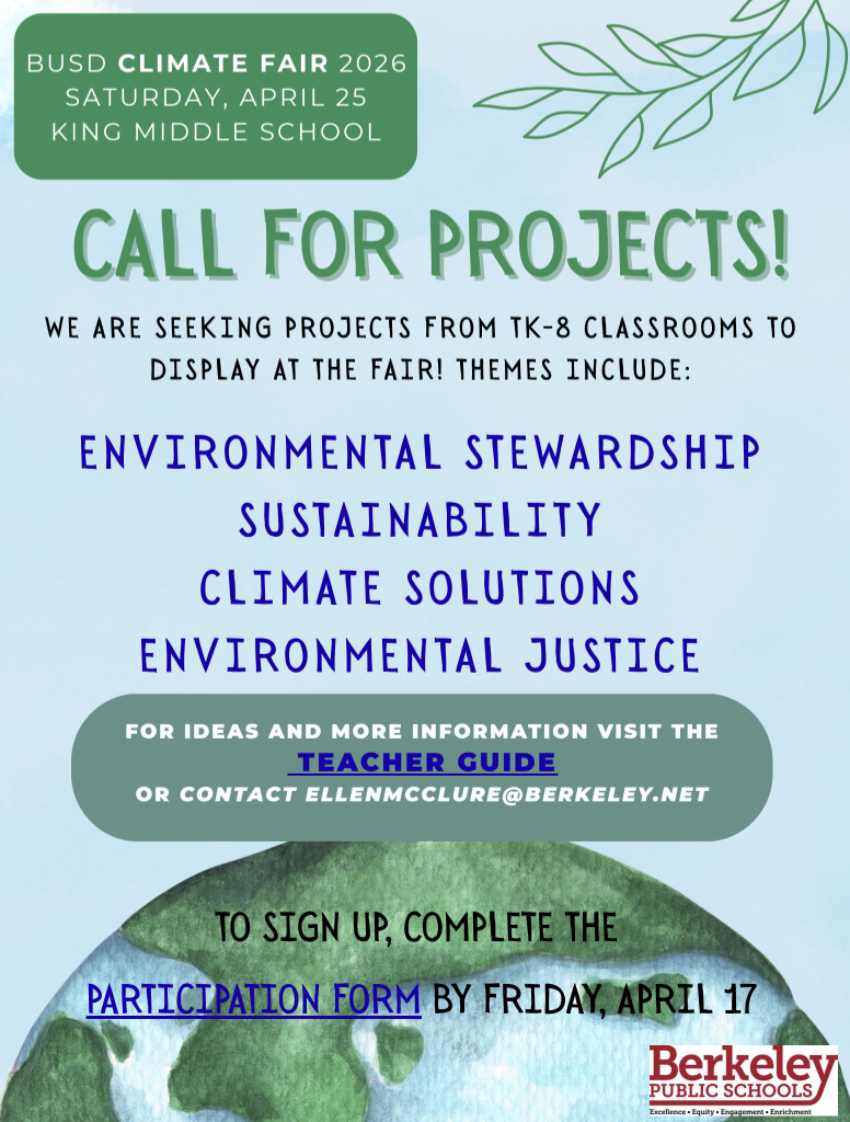 Saturday, April 25, 10:00 am - 2:00 pm: BUSD Climate Fair, King Middle School, Please see the flyer for details and how to participate.