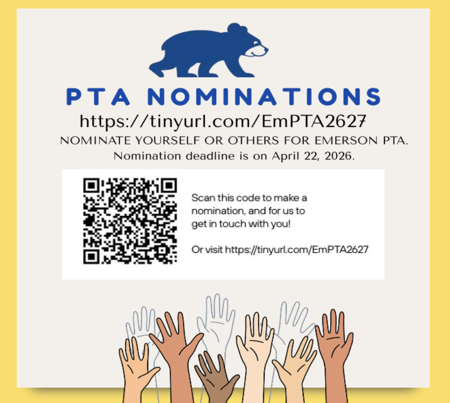 NOMINATE YOURSELF OR OTHERS FOR EMERSON PTA. Nomination deadline is on April 22, 2026. Click Here to make a nomination or scan the QR code.